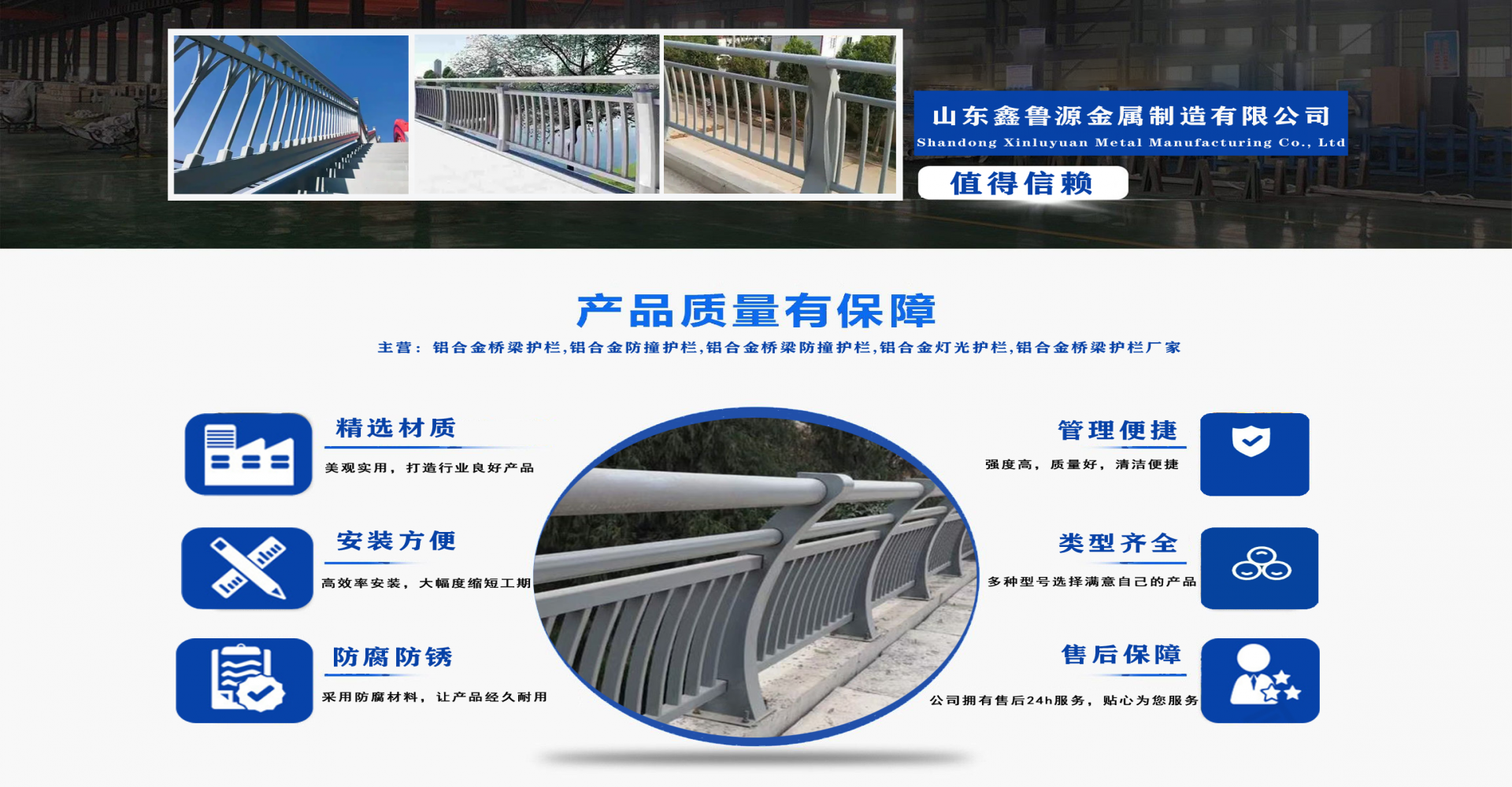 山東鑫魯源金屬制造有限公司主要經(jīng)營(yíng):鋁合金橋梁護(hù)欄,鋁合金防撞護(hù)欄,鋁合金橋梁防撞護(hù)欄,鋁合金燈光護(hù)欄,不鋁合金橋梁護(hù)欄廠家,環(huán)波梁橋梁護(hù)欄,環(huán)波梁防撞護(hù)欄。質(zhì)量可靠、經(jīng)濟(jì)實(shí)用的顯著特點(diǎn)。公司為客戶提供可靠售后保障,堅(jiān)持“以品質(zhì)立足、服務(wù)求發(fā)展”,愿與各界朋友精誠(chéng)合作、攜手發(fā)展! 服務(wù)優(yōu)勢(shì):真誠(chéng)的服務(wù)理念、完善的服務(wù)體系。公司專業(yè)力量充足;工程案例眾多、從業(yè)經(jīng)驗(yàn)豐富;公司以可靠質(zhì)量的產(chǎn)品,合理的價(jià)格,完善的售后服務(wù),能夠滿足市場(chǎng)各個(gè)企業(yè)的需求?! ∑髽I(yè)精神:執(zhí)著追求 持續(xù)創(chuàng)新執(zhí)著追求,就是堅(jiān)持不懈、堅(jiān)定從容,專注于自己的事業(yè),把能做的事情做好,不斷克服困難、把握機(jī)遇,贏得未來(lái)?! 〕掷m(xù)創(chuàng)新,就是生命不息、創(chuàng)新不止,通過(guò)持續(xù)實(shí)施技術(shù)創(chuàng)新、管理創(chuàng)新、市場(chǎng)創(chuàng)新,獲取持續(xù)的競(jìng)爭(zhēng)優(yōu)勢(shì)。...